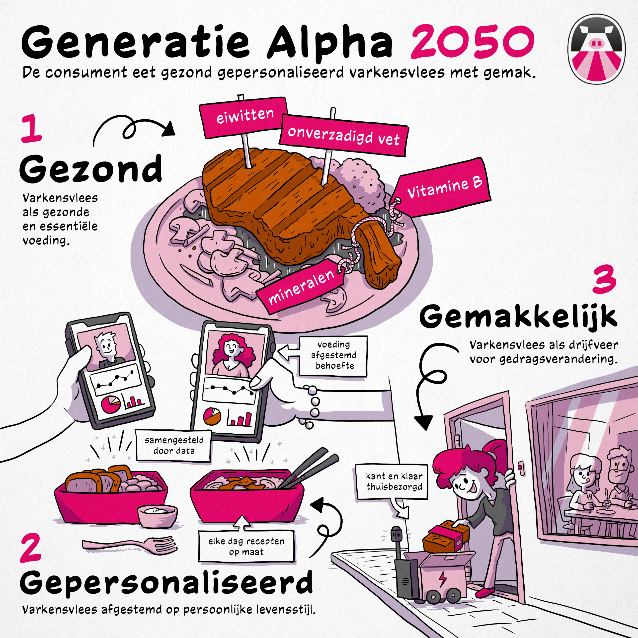 Met Generatie Alpha 2050 schetsen wij een wereld waarin technologie, gezondheid en voedsel nauw met elkaar verbonden zijn. De consument van 2050 eet bewust, op maat én duurzaam. Varkensvlees blijft daarin een belangrijke rol spelen als betrouwbare bron van eiwitten, vitamines en mineralen, afgestemd op persoonlijke behoeftes.